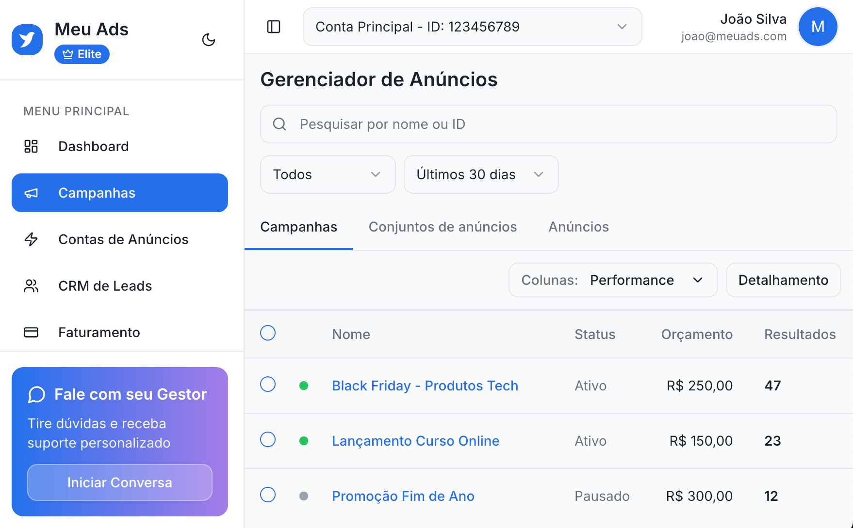 Sim! A Meu Ads oferece relatórios detalhados com métricas essenciais para que você acompanhe o desempenho de suas campanhas em tempo real.
